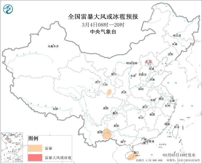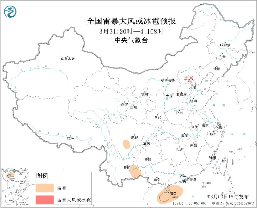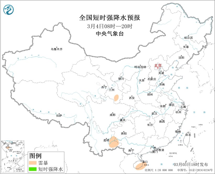 预计3月3日20时至4日20时,海南岛东部和南部等地的部分地区将有短时强降水天气,小时雨量20-30毫米,局地可达40毫米以上。